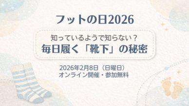 お知らせ&最新情報 フットの日2026|知っているようで知らない?毎日履く「靴下」の秘密 毎日履く「靴下」について、企業の研究開発担当者と足育の視点から学ぶ無料オンラインイベント。2026年2月8日開催。申込制、アーカイブ配信あり。 2025.12.26 お知らせ&最新情報