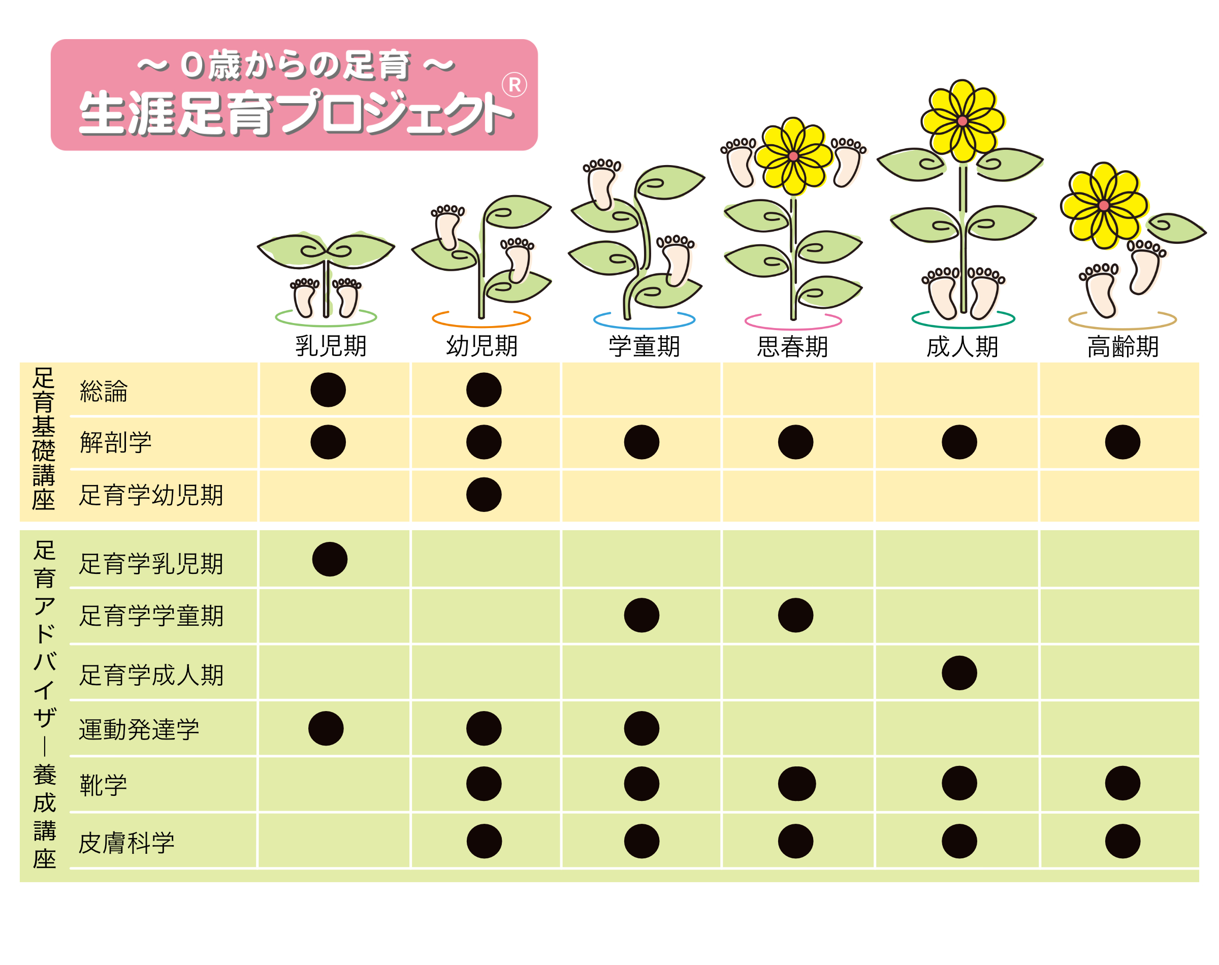 そして第2段階である養成講座では、6つのライフステージすべてにわたる足育学をはじめ、足育に不可欠な靴学、皮膚科学、運動発達学などを学びます。